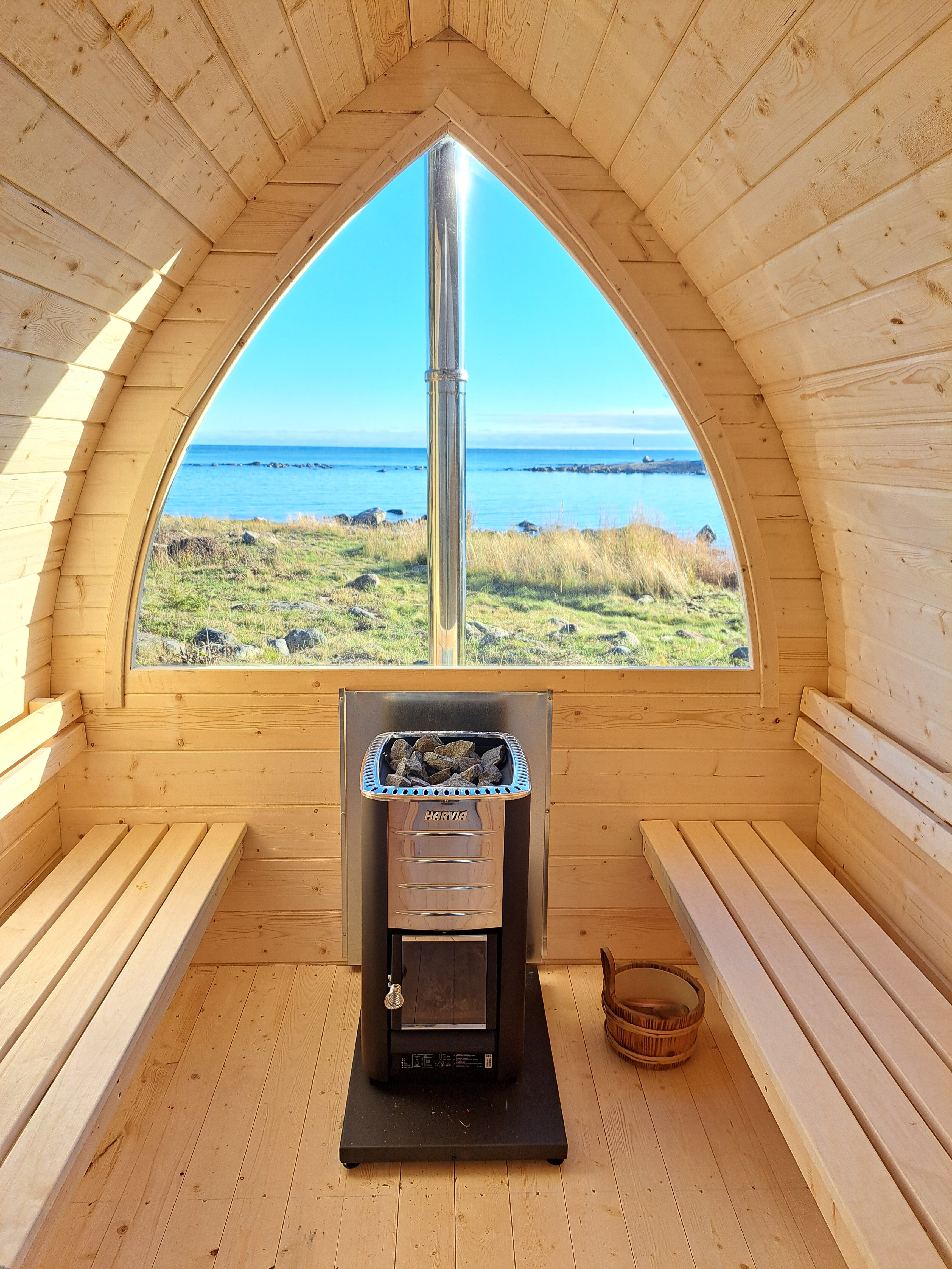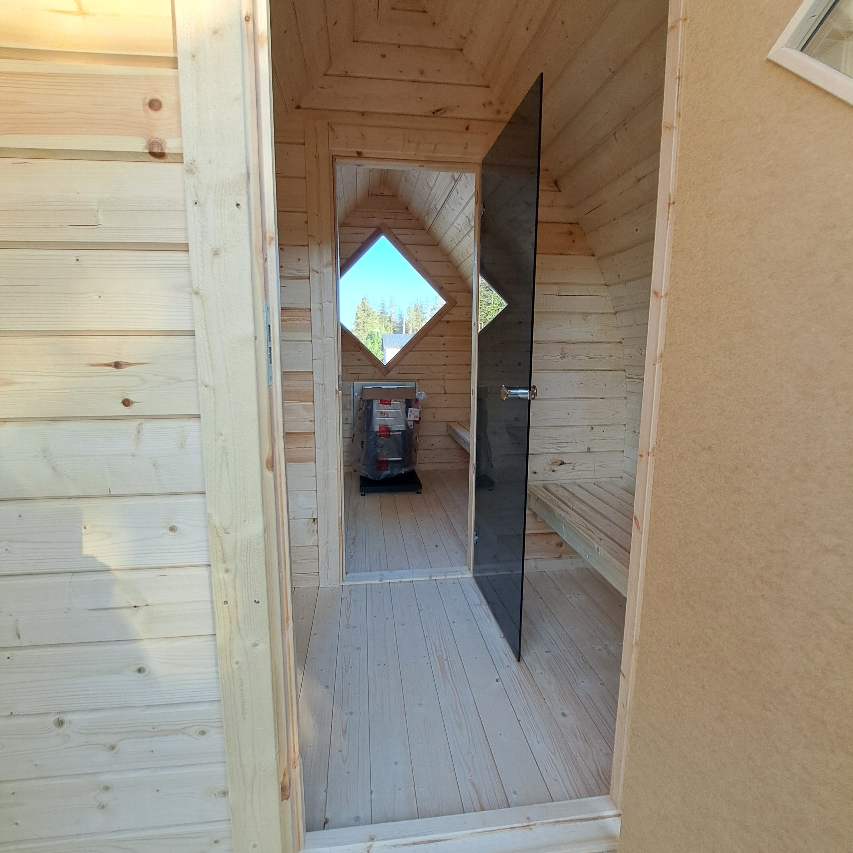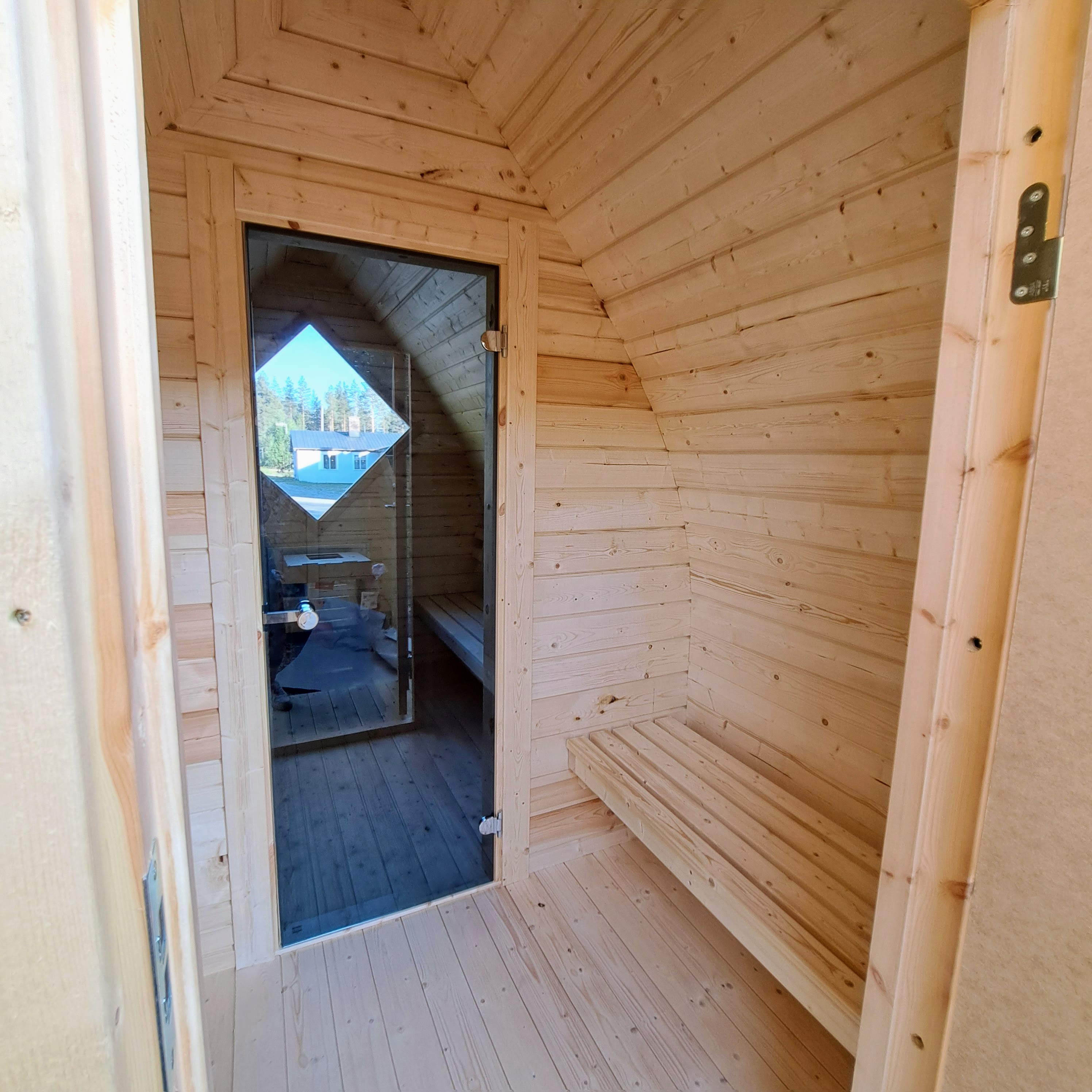 Lämpligt för dig som tänker placera bastun nära andra byggnader. - Formskuren design på fönster