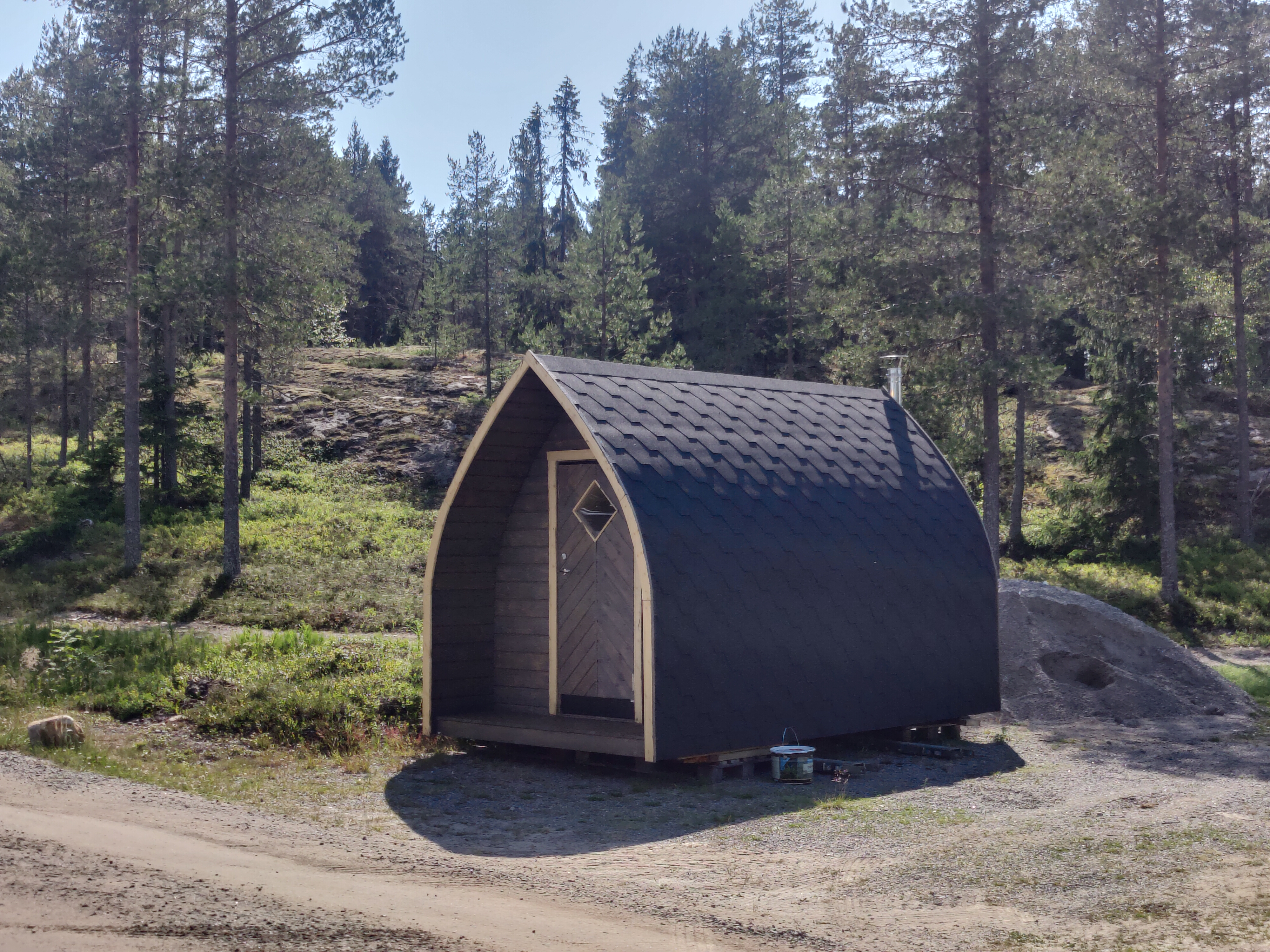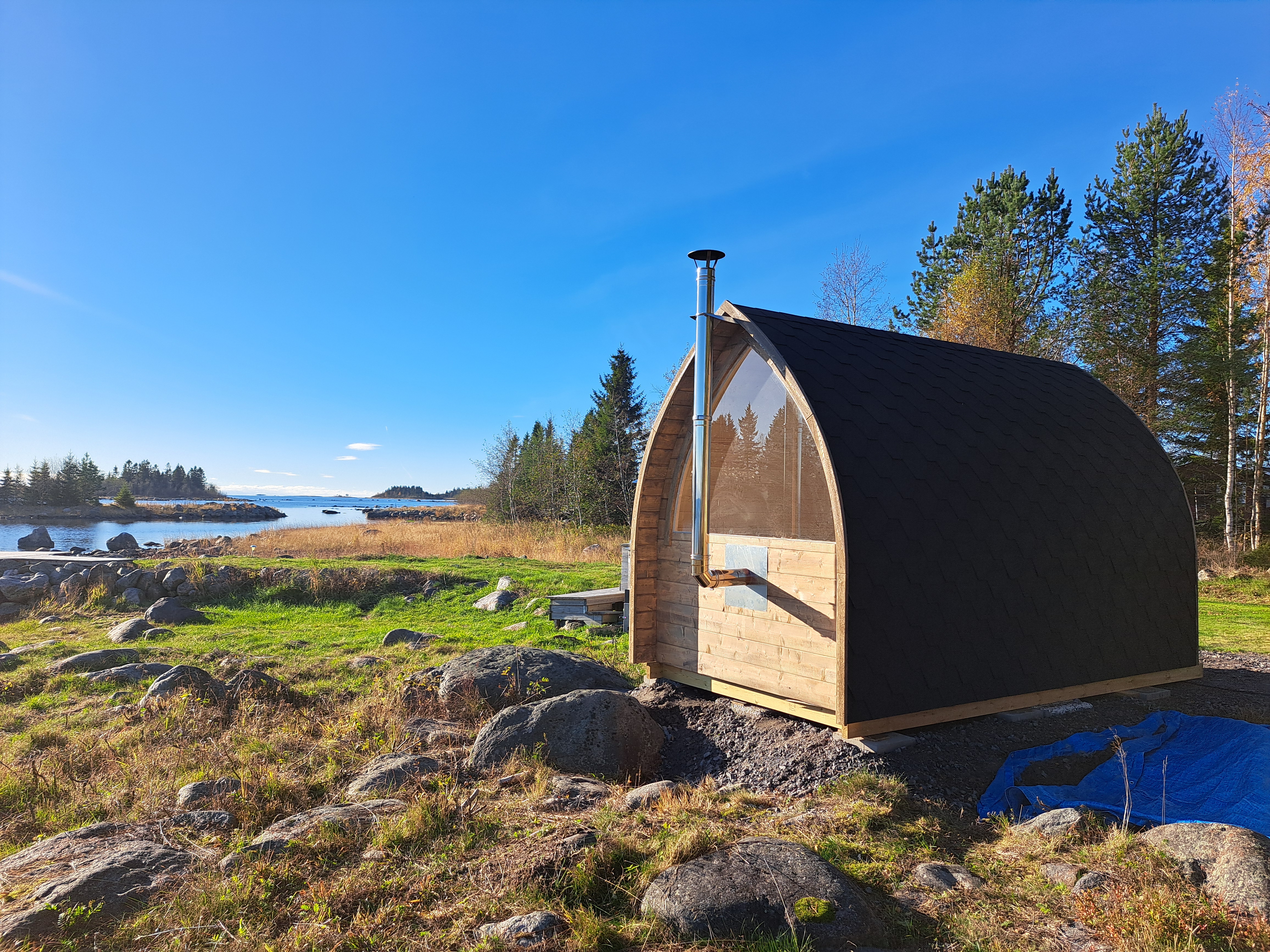 Välgjord bastustuga för 4-6 personer i helt ny modern design. Tak och väggar av 40mm norrländskt spontat virke av högsta kvalitet och bastulavar i asp. Vedeldat bastuaggregat, rostfri skorsten och tak av shingel.