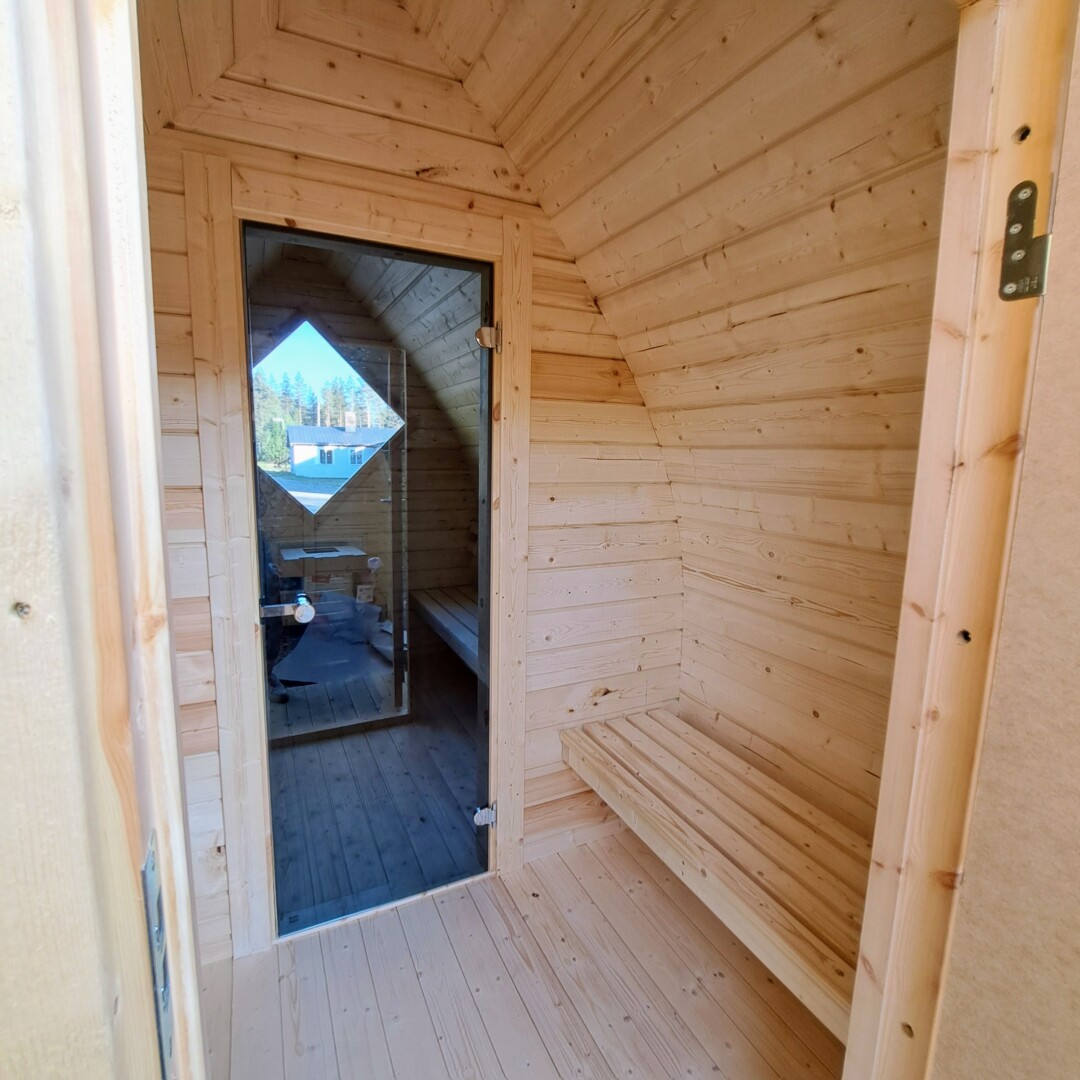 Lämpligt för dig som tänker placera bastun nära andra byggnader. - Formskuren design på fönster